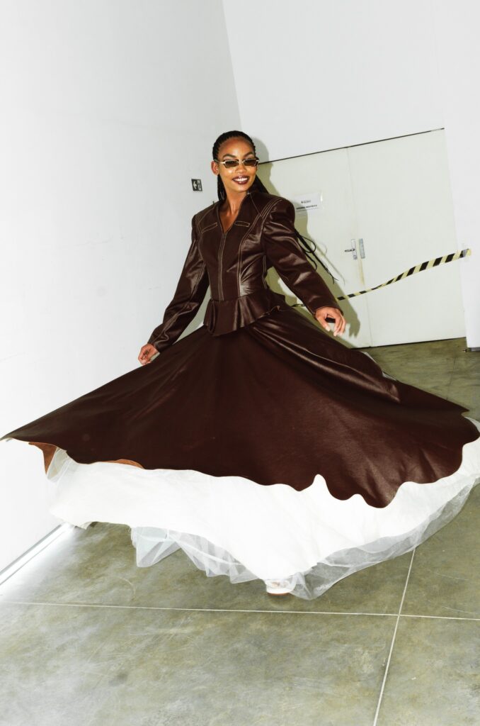‘Brasiliano 3’ nasce dessa sobrevivência e celebra uma resistência que se reinventa e floresce. Inspirada nas estéticas dos Bailes Black dos anos 70 e 80, a Dendezeiro coloca a moda como ferramenta política e de memória, expressão viva nos bailes funks de hoje. A coleção une streetwear e alfaiataria, atitude e corpo em movimento, moda no ritmo do batidão. Com looks inéditos, o desfile contou com trilha sonora ao vivo colocando o funk no centro da cena.