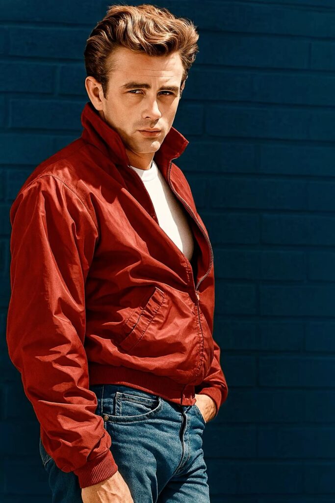 O fenômeno cultural em torno de James Dean consolidou-se em 1955, durante as filmagens de “Juventude Transviada”, obra que imortalizou sua imagem através da icônica jaqueta vermelha em estilo Harrington. O uso da peça com a gola levantada tornou-se um marco visual no cinema e na indústria da moda, estabelecendo definitivamente o arquétipo do “rebelde” no imaginário global.