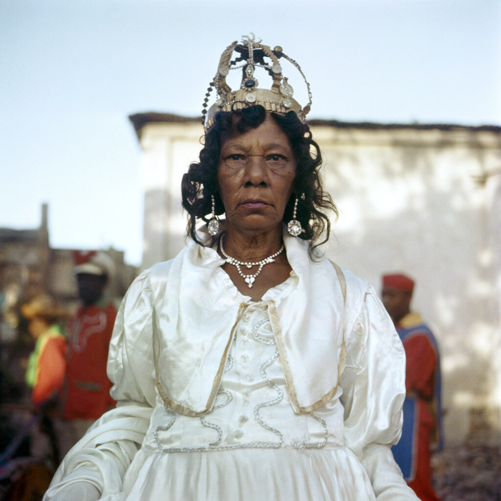 Retrato de uma mulher durante dança Carabalí Isuama, de origem francesa do Haiti, Santiago, Cuba, 1963Em suas incursões pelo mundo, Varda também viveu entre 1967 e 1968 na Califórnia, nos Estados Unidos, com seu marido, o diretor Jacques Demy, que filmava em Hollywood. No novo país, encontrou um ambiente marcado pelos protestos contra a Guerra do Vietnã e pelos movimentos de resistência política e cultural. A exposição apresenta imagens produzidas pela artista nesse período, com destaque para sua documentação dos Panteras Negras. Em 1968, em Oakland, Varda documentou o julgamento de Huey Newton, cofundador do partido. A mobilização em torno do processo judicial transformou-se em um encontro público de denúncia da violência policial e de afirmação política do movimento negro. Com uma câmera 16 mm, Varda registrou a dimensão histórica da manifestação, como também os pequenos gestos, rostos e detalhes, resultando no filme Os Panteras Negras, também exibido no cinema do centro cultural.